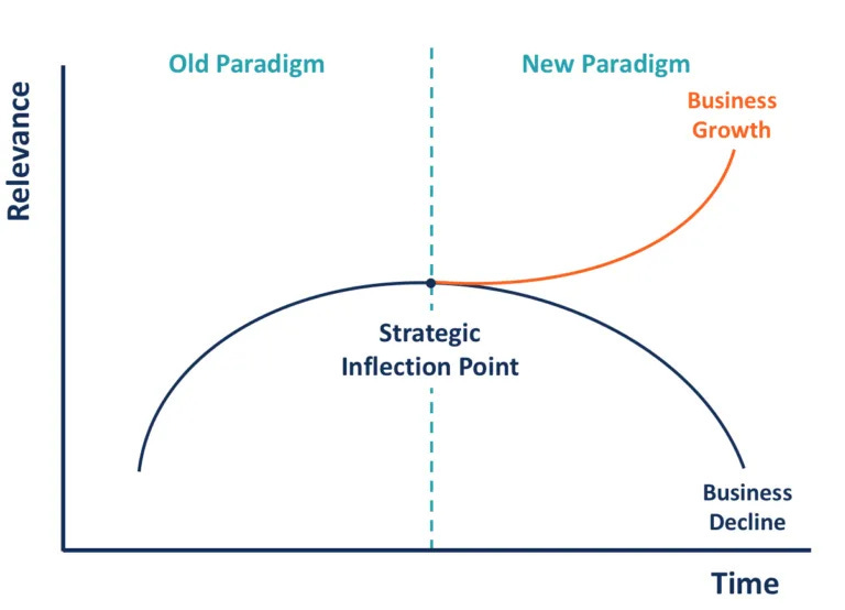 A time in a business’s life when its fundamentals are about to change, potentially leading to either great opportunity or significant decline, requiring a fundamental shift in strategy