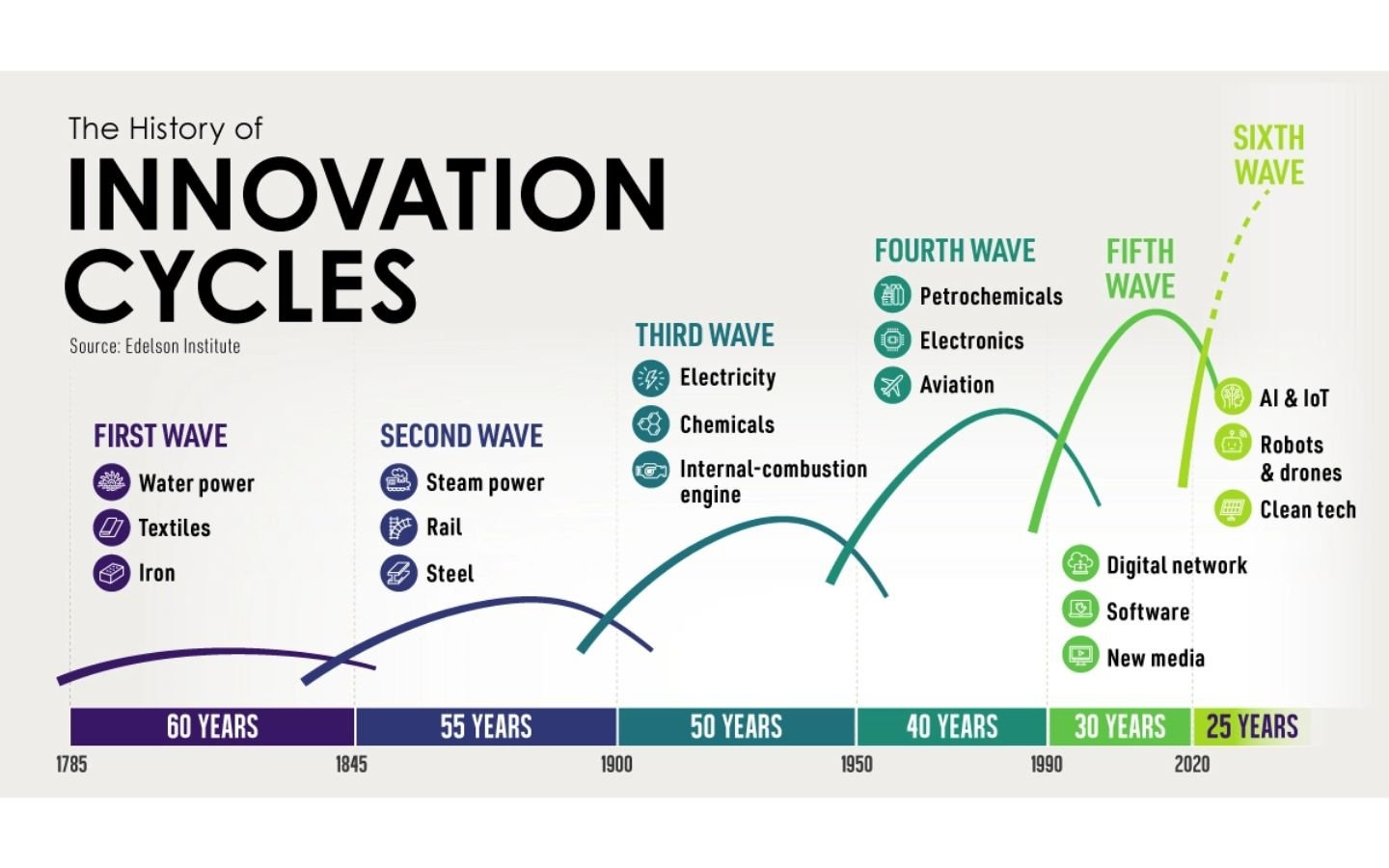 Economist Joseph Schumpeter coined the term creative destruction. This is the idea that innovation deconstructs established structures leading to new and more efficient systems. This is visualised above in 6 major cycles of innovation from 1785 to the present day.